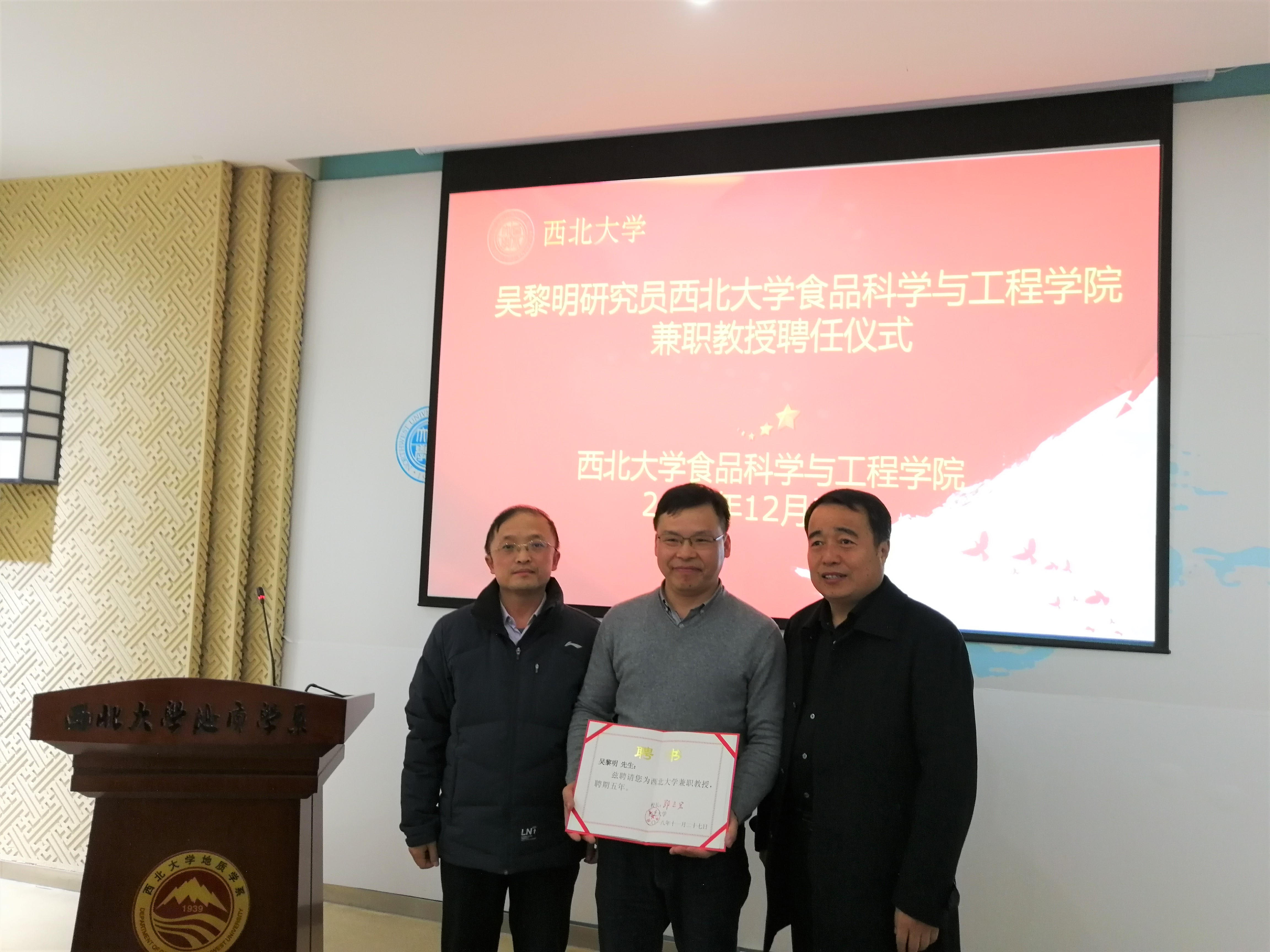 报告会前,曹炜副院长首先致欢迎词并介绍了吴黎明研究员的基本情况,随后,李振海处长向吴黎明研究员颁发了西北大学兼职教授聘书和名牌。
