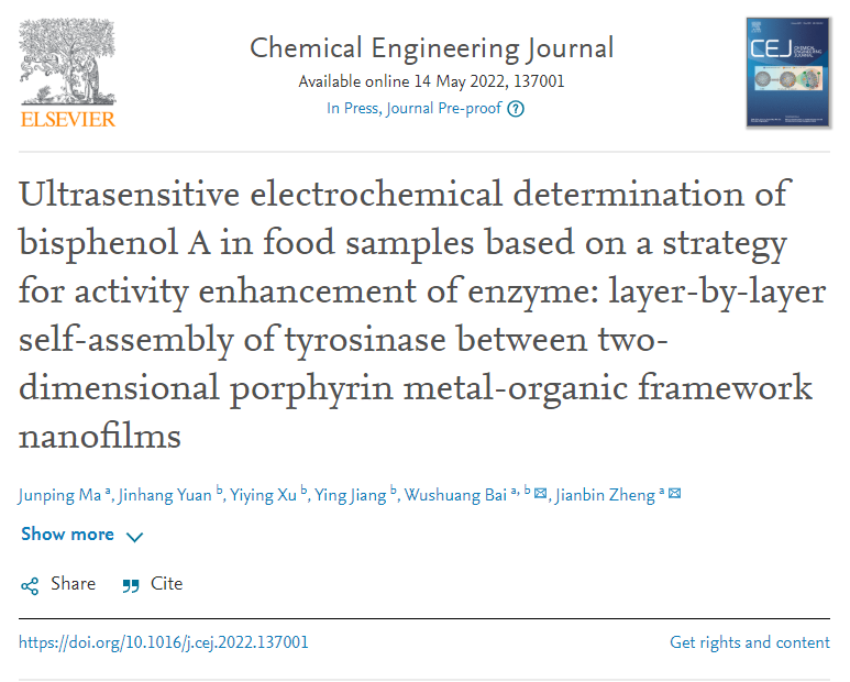 近日,beat365在线体育官网青年教师白武双副教授指导本科生(2017级袁锦航、姜英,2018级徐懿莹)在国际顶级期刊《Chemical Engineering Journal》(中科院1区TOP,Q1区,2020-2021年影响因子13.273,即时影响因子>16)上在线发表了最新科研成果:“Ultrasensitive electrochemical determination of bisphenol A in food samples based on a strategy for activity enhancement of enzyme: layer-by-layer selfassembly of tyrosinase between two-dimensional porphyrin metal-organic framework nanofilms”(Chemical Engineering Journal,doi: https://doi.org/10.1016/j.cej.2022.137001)。该成果孵化于陕西省大学生创新创业训练计划项目(牛奶中双酚A的快速测定,No. S202010697171,项目负责人:2017级本科生袁锦航,参与人:2017级本科生姜英、2018级本科生徐懿莹),体现了beat365在线体育官网对本科生科研能力培养的高度重视。