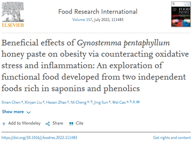 本研究基于曹炜教授团队多年在蜂产品成分及活性研究领域的工作基础,相关成果以“Beneficial effects of Gynostemma pentaphyllum honey paste on obesity via counteracting oxidative stress and inflammation: an exploration of functional food developed from two independent foods rich in saponins and phenolics”发表在食品科技领域顶级期刊《Food Research International》(中科院1区 TOP, Q1区,2021-2020年影响因子6.475)。该论文的第一作者为博士生陈思南,通讯作者为曹炜教授。研究工作得到了国家自然科学基金(31871876)、陕西省高层次人才专项支持计划(TZ0389)和陕西省科技计划(2022FP-12、2022FP-14)的资金支持。绞股蓝蜜膏加工技术及产品已在陕西老蜂农蜂业有限责任公司应用,取得了较好的经济效益。