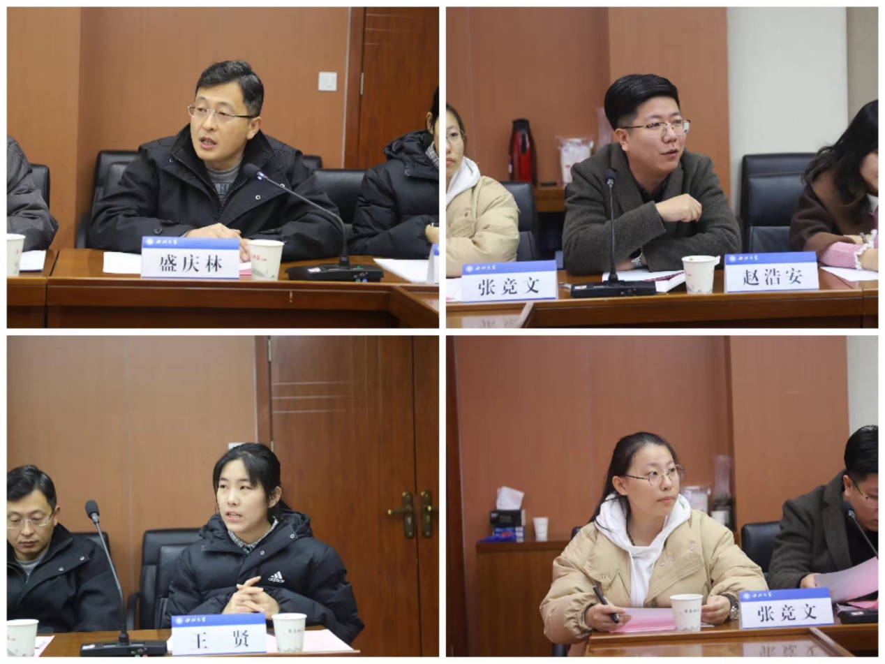 岳田利院长代表班子,从学院学科体系、学科平台、研究基地、师资队伍、国际合作、人才培养、科学研究、学科整体水平、同行比较、存在问题、工作思路、求解问题等十二个方面汇报了学院建设发展情况、面临困难问题、下一步工作思路举措。师生代表盛庆林、赵浩安、王贤、张竞文分别发言提出了意见建议。