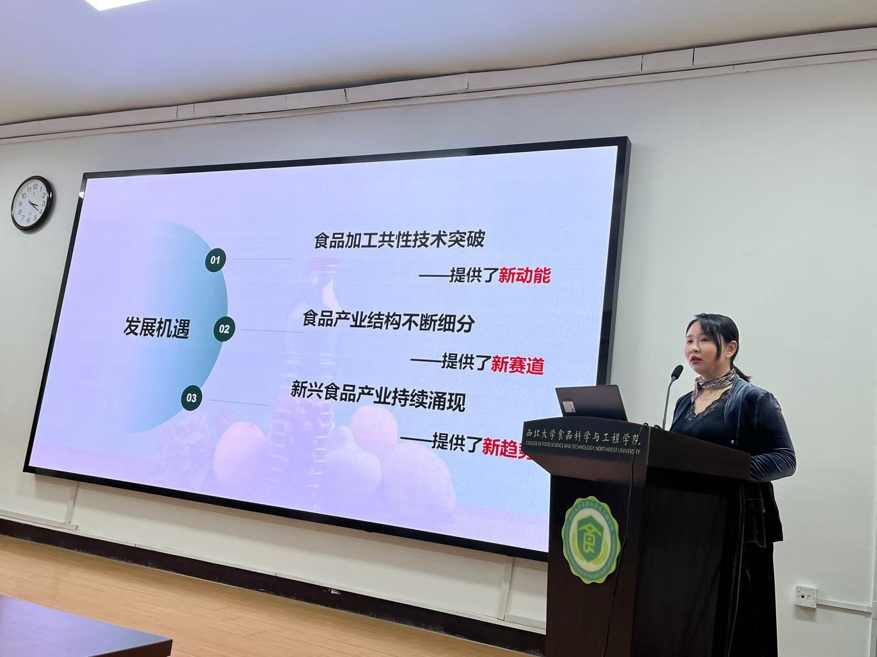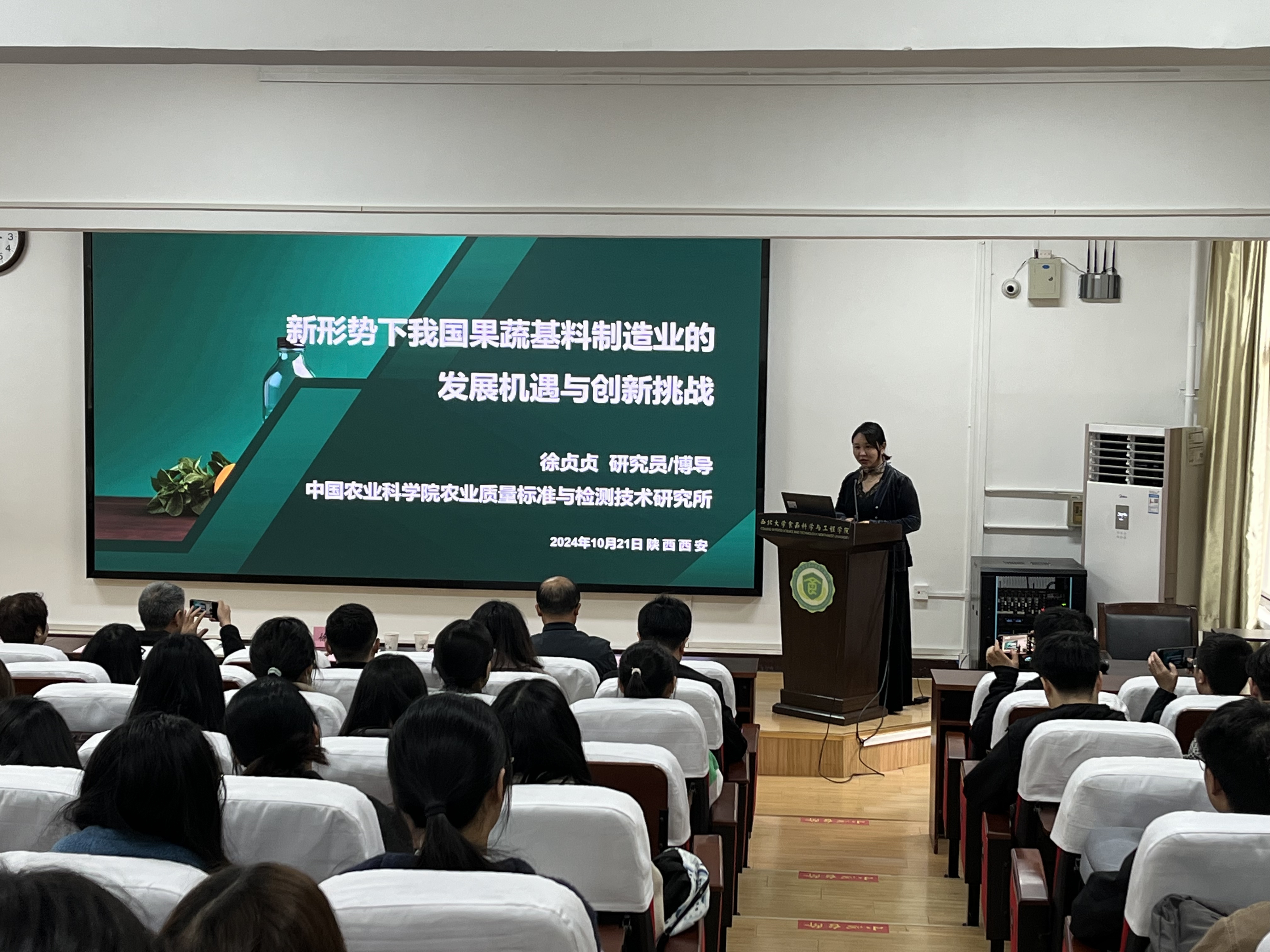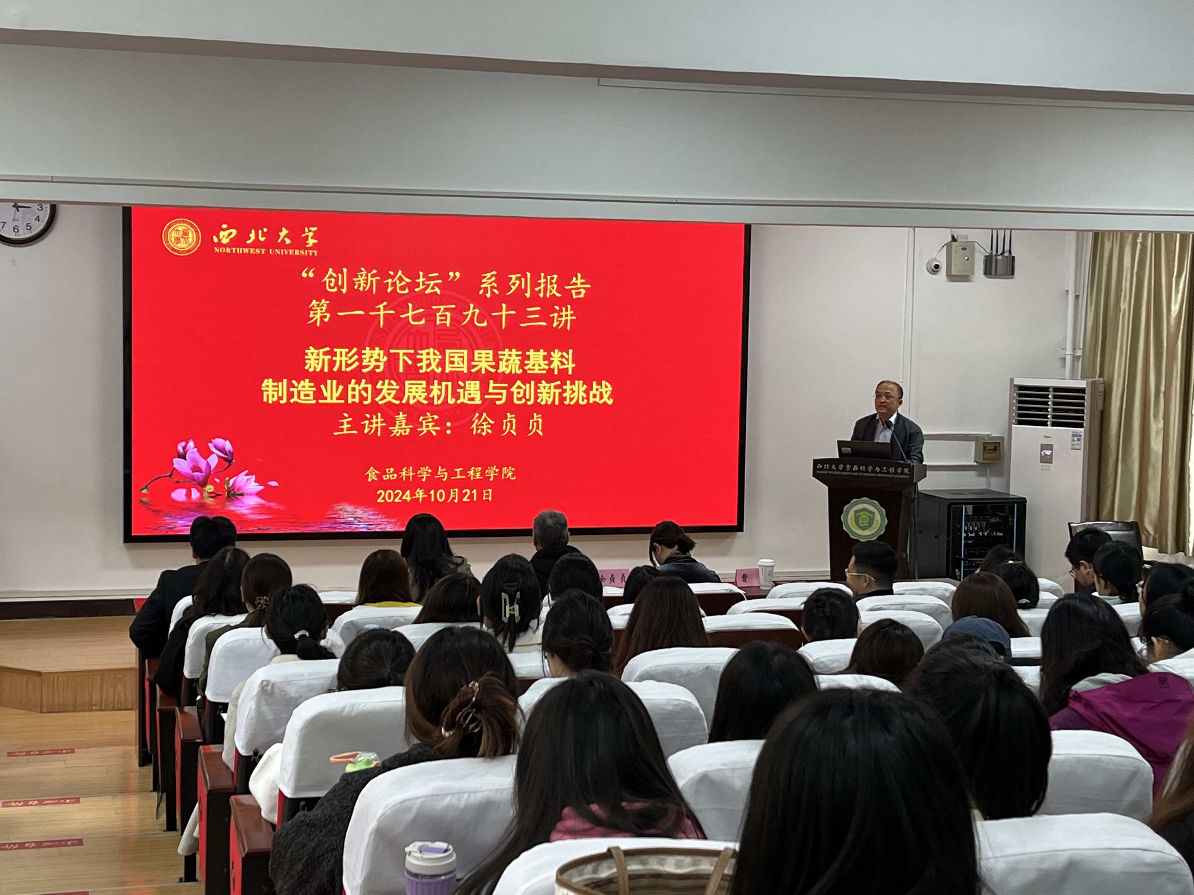 10月21日,由beat365在线体育官网科技处、科协主办,食品科学与工程学院承办的“西北大学创新论坛”第一千七百九十三讲在太白校区举行。徐贞贞研究员应邀来校为师生做了题为“新形势下我国果蔬基料制造业的发展机遇与创新挑战”的报告。beat365在线体育官网相关专业师生代表参加了报告会。报告会由曹炜副院长主持。