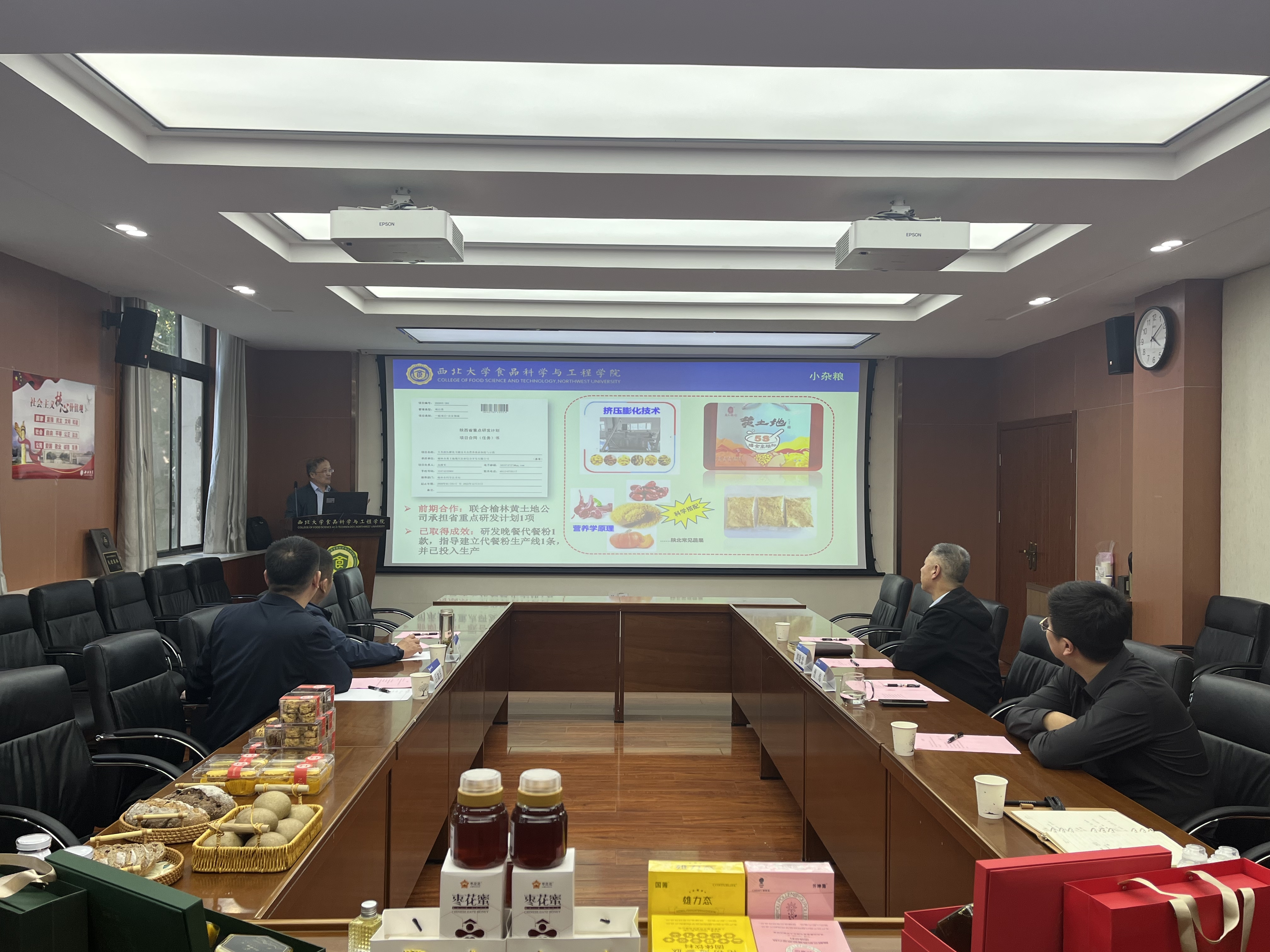 曹炜教授介绍了团队近几年在佳县开展的科技帮扶工作,重点介绍了枣花蜜和小杂粮食品等方面取得的研究成果以及在佳县企业的落地应用情况,并表示希望带领团队继续为佳县的食品产业做好科技支撑服务。