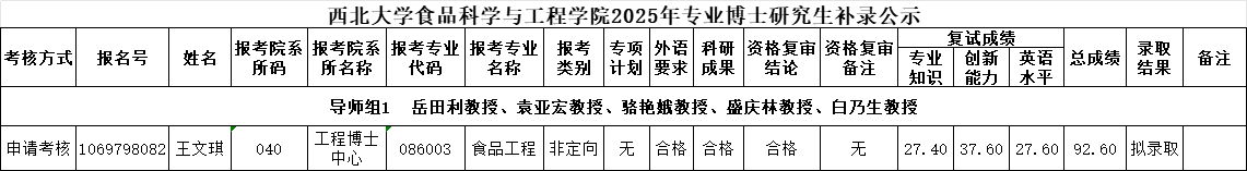 现将beat365在线体育官网2025年专业博士研究生招生增补拟录取结果公示如下,对下述情况有异议者,请在结果公示之日起5个工作日内(2025年6月11日17:00-2025年6月17日 17:00)向食品科学与工程学院研究生招生办公室反映,反映材料需实名提交,以便学院核实并反馈。