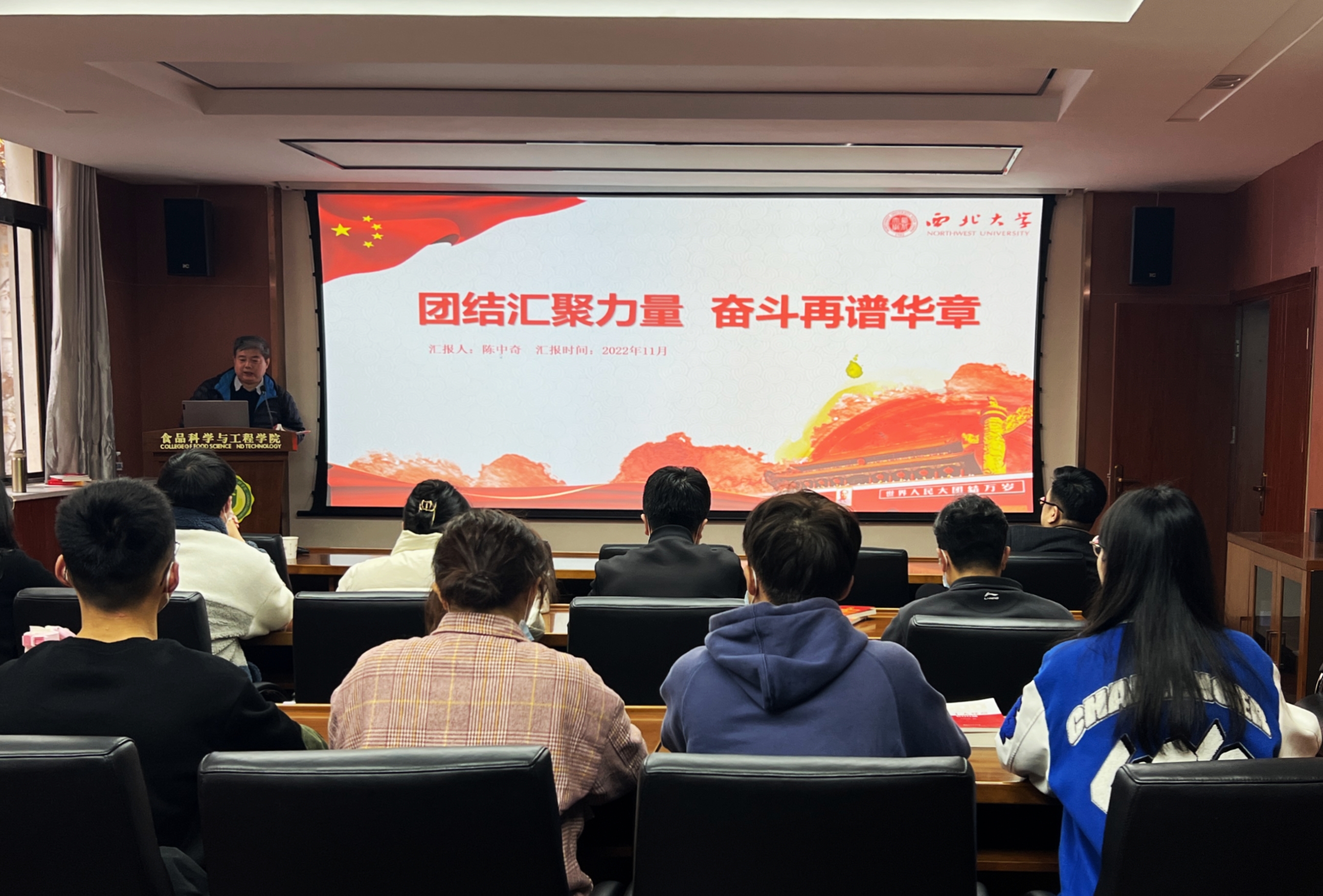 1124日,学院党委理论学习中心组召开党的二十大精神专题学习(扩大)会,邀请校党的二十大精神宣讲团成员、马克思主义学院陈中奇教授作《团结汇聚力量 奋斗再谱华章》辅导报告。学院党政班子成员、党委委员、工会主席、科级干部、党支部书记和委员、学生工作干部和学生骨干等参加会议。会议由学院党委有关负责人主持。