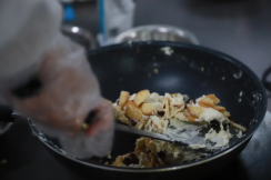 棉花糖和奶粉翻炒均匀后加入蔓越莓干、饼干碎,翻炒至均匀;