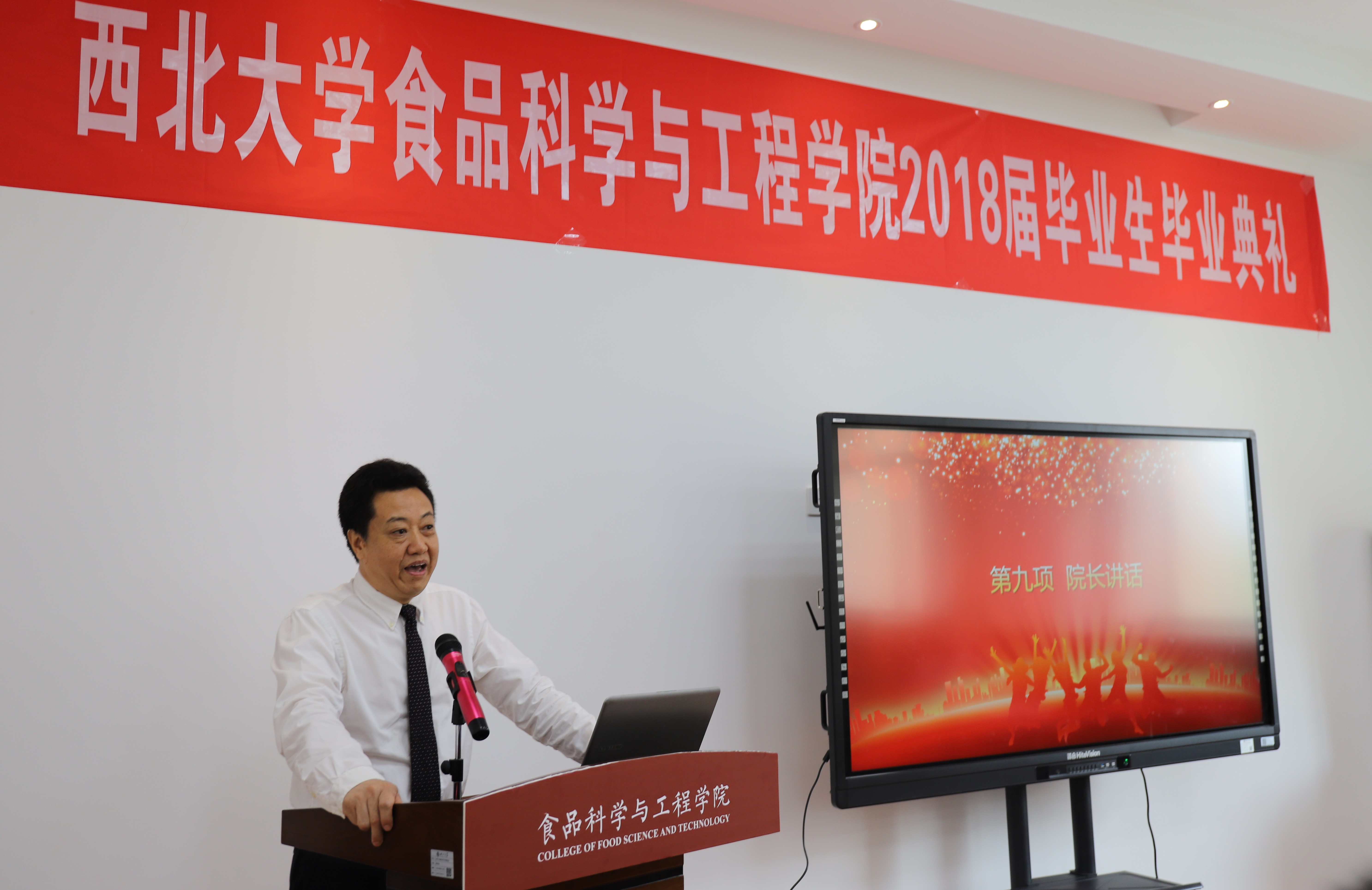 樊君教授代表全体教师向毕业生的顺利毕业表示了热烈祝贺。他说,同学们圆满完成学业走向人生的下一站,即将进入一所名叫“社会”的大学,希望大家树立远大理想,志存高远,以积极向上的人生态度去创造属于自己的新天地;学会做人,在各方面不断完善自我,保持健康的体魄和心态,充满信心地面对未来;学会坚持,对认准的正确选择要不懈坚持,勇于实践,开拓创新,争取成功。