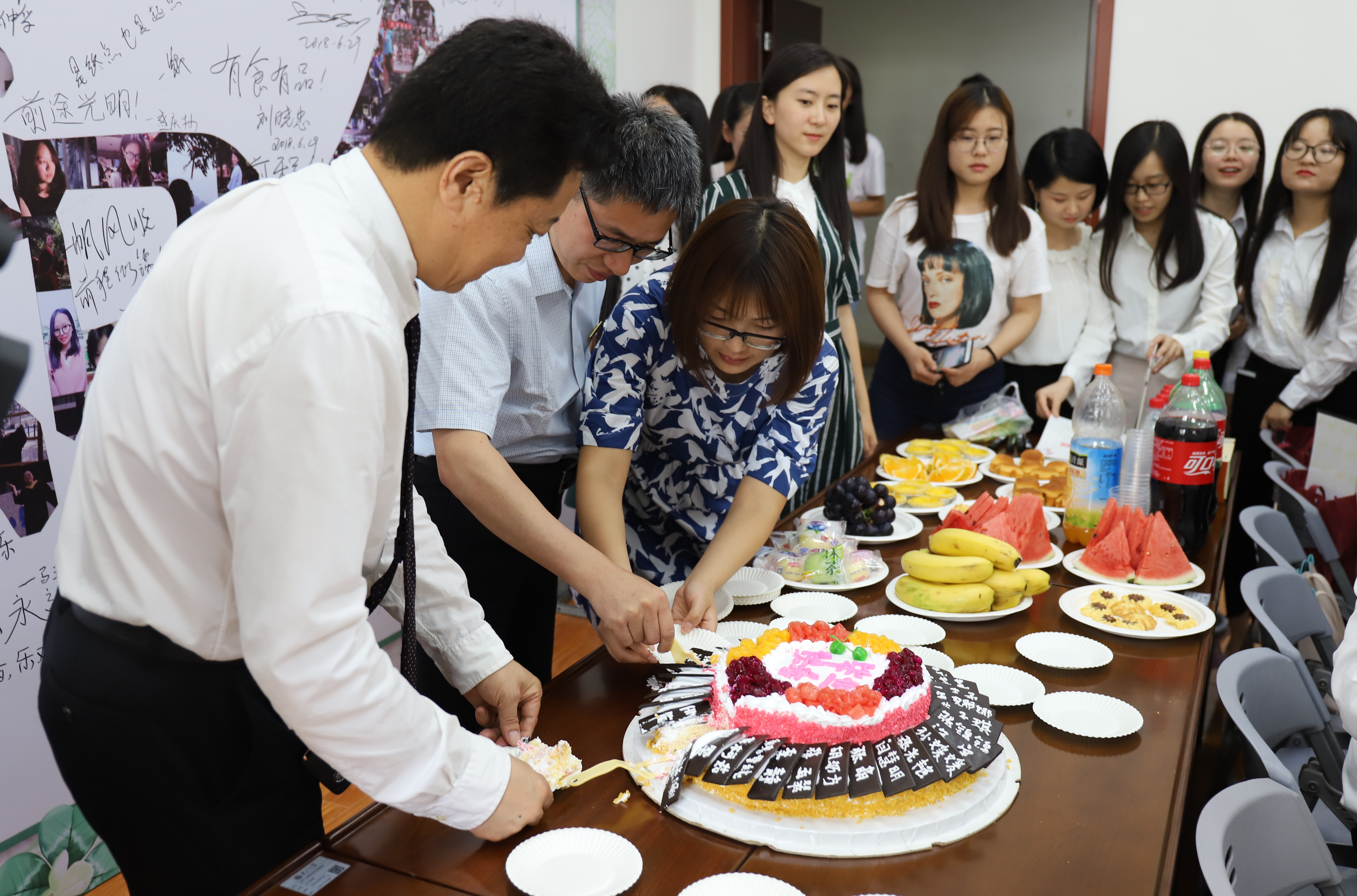 学院老师为毕业生分切毕业蛋糕