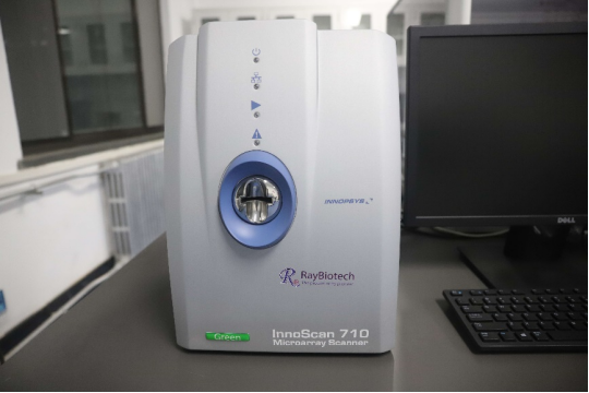 芯片扫描仪品牌:RayBiotech型号:InnoScan 710G所在实验室:6405联系人: 029-88302460性能特点:1. 检测原理:激光共聚焦扫描2. 扫描通道:单通道,激发波长:532nm3. 均一性:<5% CV4. 分辨率:3-40μm/像素5. 扫描区域:不小于22×74mm26. 可检测荧光标记物:Cy3,Alexa 546,Alexa 5557. 扫描速度:1-35行/秒,3.55分钟/张8. 激光强度调节范围:1-100%连续可调,最小调幅1%。应用范围:利用激光共聚焦扫描进行高灵敏度扫描...
